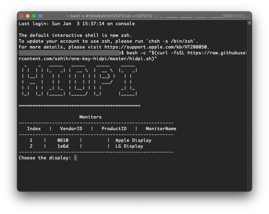 | bash -c "$(curl -fsSL https://raw.githubusercontent.com/xzhih/one-key-hidpi/master/hidpi.sh)" |